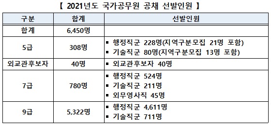 2021년도 국가공무원 공개채용 선발 인원이 6450명으로 확정됐다.