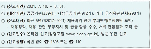 국민권익위원회(이하 국민권익위)는 이 달부터 두 달 동안 최근 5년간 공공기관의 채용 관련 부정청탁, 시험·면접점수 조작, 정규직 전환 특혜 등 채용비위에 대해 집중신고를 받는다고 19일 밝혔다.