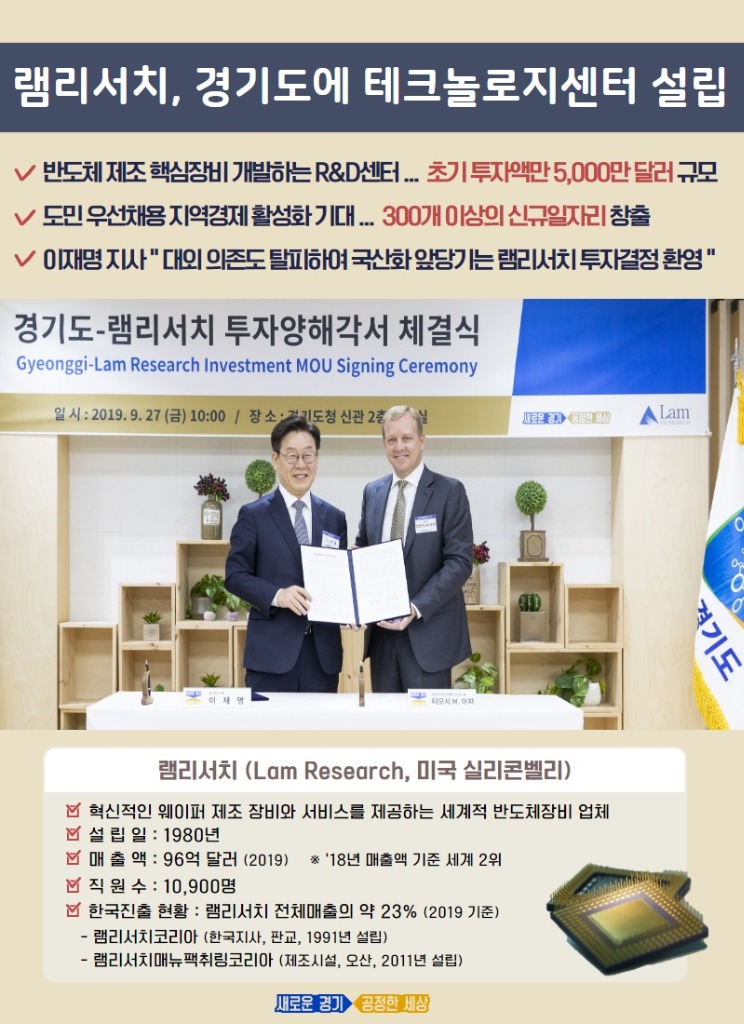 경기도가 세계적인 반도체장비 기업인 ‘램리서치’와 ‘투자양해각서(MOU)’를 체결하고, 반도체 제조공정의 핵심장비를 연구·개발하는 R&D센터인 ‘한국테크놀로지센터(가칭)’ 설립을 공동으로 추진해 나가기로 했다.