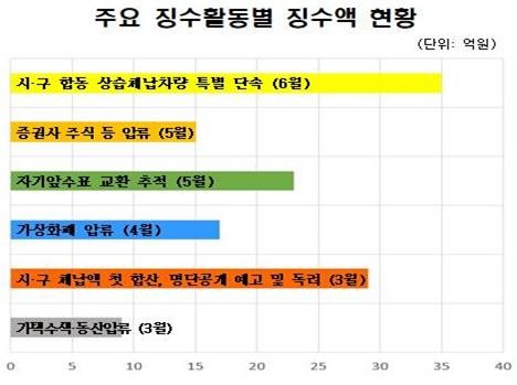 시가 상반기에 추진한 주요 체납징수 활동별 징수금액은 ▴전국 지자체 최초 가상자산 압류 17억2,807만 원 ▴현금을 자기앞수표로 교환한 재산은닉자 추적 23억5,614만 원 ▴3,000만 원 이상 고액체납자 해외출국금지 8억8,512만 원 ▴최00 전 000회장 등 비양심 고액체납자 가택수택 및 동산압류 9억919만 원 ▴1,000만 원 이상 고액체납자 명단공개 예고 28억9,523만 원 ▴경찰청‧자치구 등 유관기관 상습고액체납 차량 합동단속 8,512만 원 ▴체납자 소유 법원 공탁금 압류 3,359만 원 등이었다.