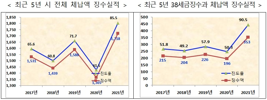 서울시는 이런 내용으로 2021년 상반기 체납세금 징수실적 분석결과를 발표했다. 6월 말 기준으로 서울시 38세금징수과와 25개 자치구가 징수한 총 체납액은 1,718억 원으로, 전년 동기(1,365억 원)보다 353억 원(25.9%) 증가했다.