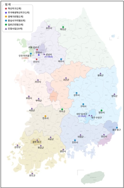 아울러 국토부는 구도심 상권 활성화 및 도시문제 해결을 위해 중심시가지형 6곳과 일반근린형 3곳 및 인정사업 19곳도 선정, 추진한다.