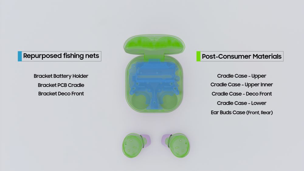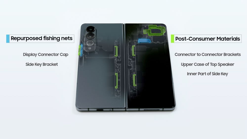 특히 ‘갤럭시 Z 폴드4’의 △사이드 키 브라켓 △디스플레이 커넥터 커버, ‘갤럭시 Z 플립4’의 △볼륨키 브라켓, ‘갤럭시 버즈2 프로’의 △배터리 장착부 브라켓 △크래들 PCB 장착부 브라켓 △내장기구 강성 보강 브라켓 등에는 폐어망을 재활용해 만든 소재가 적용됐다.