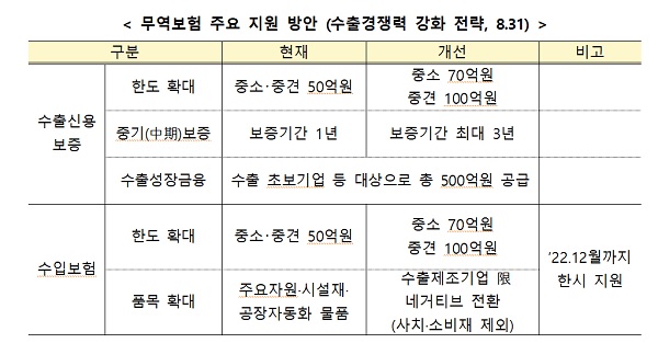 고금리와 원부자재 가격 상승으로 자금난을 겪는 중소·중견기업에 수출신용보증 한도를 높여 자금지원을 확대하고, 수입보험 대상품목·한도도 확대할 계획이다.