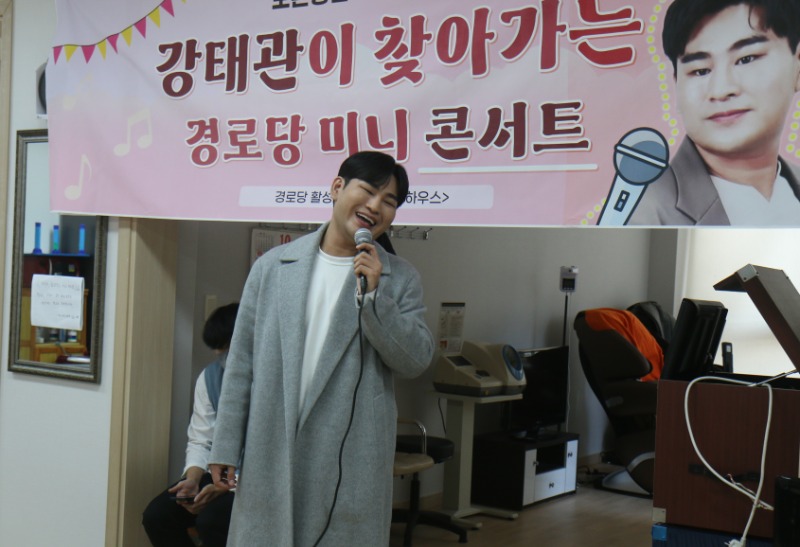 가수 강태관은 “찾아가는 미니 콘서트”에서 미스터트롯의 ‘한 오백년’ 뿐 아니라 ‘내 인생의 고속도로’ 그리고 10월 발매된 신곡 ‘별’ 무대를 펼쳤으며 흔들림 없는 가창력과 호소력 진한 음색으로 어르신들의 마음에 잔잔한 감동을 주었다.