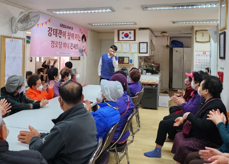 성남시 도촌종합사회복지관이 주최하고 넥스타엔터네인먼트 소속 트로트 가수 강태관이 무료 나눔 공연하는 “찾아가는 미니 콘서트”는 경로당 이용 어르신에게 문화향유 기회를 제공하기 위해 마련되었다