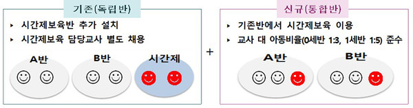 시간제보육반은 정규보육반과 분리해 별도 공간에서 독립적으로 운영하는 독립반 외에도, 어린이집 정규보육반의 비어 있는 자리를 시간제보육으로 운영하는 통합반 모형을 시범사업으로 운영하고 있다.