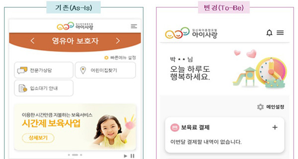 이번 개편에서는 ▲시간제보육 통합반 모바일 예약 기능 도입 ▲로그인 방식(금융인증, 간편인증, 생체인증) 추가 ▲메인화면 개편으로 가독성·접근성 향상 등도 더해졌다.