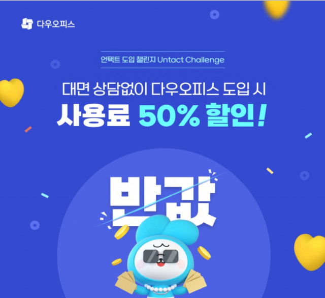 이 이벤트를 통해 대면 상담 없이 온라인만으로 쉽고 빠르게 다우오피스를 도입할 수 있으며, 연간 사용료 50% 할인이라는 혜택까지 받을 수 있다.