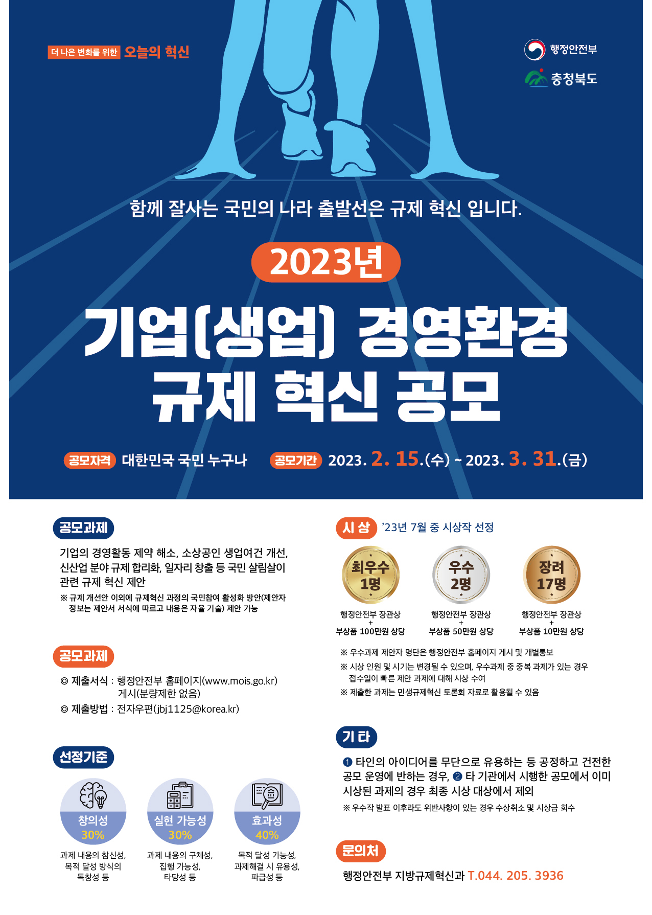 충청북도는 도민의 눈높이에서 기업과 소상공인의 경영환경 개선 등 도민 살림살이 관련 규제혁신 과제를 발굴하고 해소하기 위하여 ‘2023년 충청북도 기업(생업) 경영환경 규제 개선 도민 공모’를 추진한다고 16일 밝혔다.