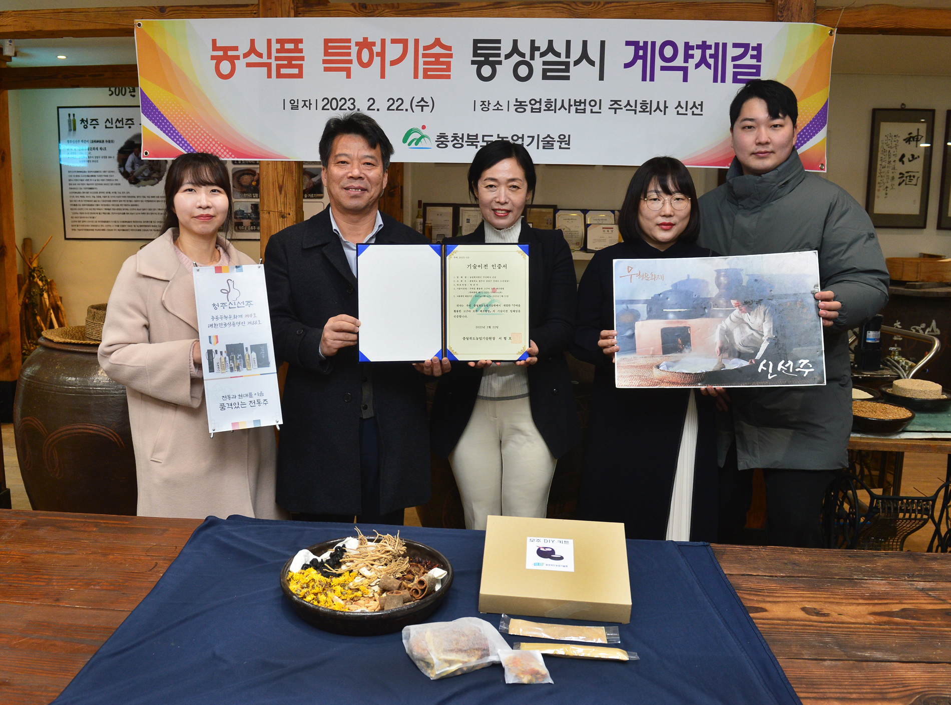 충북농업기술원은 22일 주박과 한약재로 만드는 모주 체험키트 제조에 관한 특허기술을 농업회사법인 ㈜신선(대표 박준미)과 기술이전 계약을 체결했다.