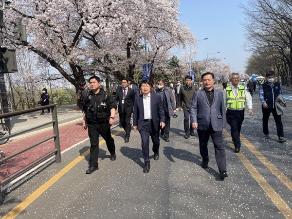 특히 이번 현장점검에서는 영등포 경찰서장으로부터 교통통제 및 인파관리 등 축제 현장 안전대책 준비상황에 대한 설명을 듣고 안전 우려사항에 대하여 논의했으며, 윤중로 인파 운집상황과 주변 위험시설물 여부 등의 파악을 위해 행사장 주변 1.7km에 걸쳐 도보 현장점검도 실시했다.