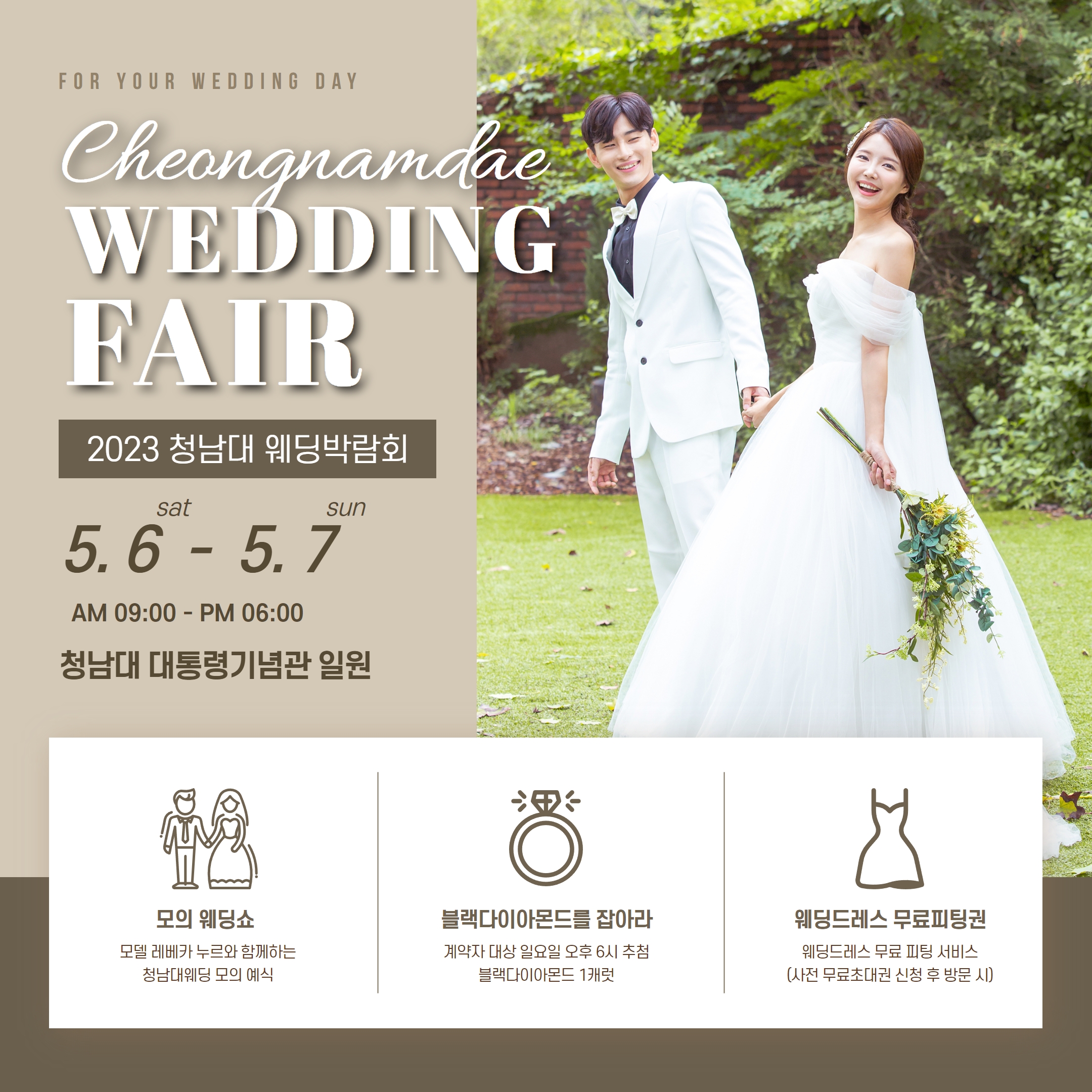 이밖에 다양한 이벤트도 함께 진행된다. 사전 참가신청한 40커플(선착순)을 대상으로 청남대 잔디밭에서 감성 피크닉을 즐길 수 있는 소풍이벤트를 진행하며 청남대 웨딩 피로연 음식의 대표 메뉴들을 선정해 무료 시식도 진행할 예정이다.