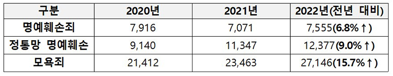 또한 명예훼손·모욕 등 각종 고소·고발이 해마다 증가하는 등 사회적 갈등을 유발하는 상황도 이어지고 있는 상황이다.