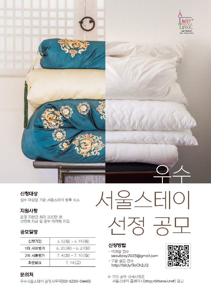 ‘우수 서울스테이’ 지원은 6월 5일(월)부터 6월 19일(월) 17시까지 전자우편 또는 구글폼을 통해 접수 가능하며, 신청 대상은 접수 마감일까지 서울 스테이 숙소 등록을 완료한 외국인관광 도시민박업 및 한옥체험업이다.