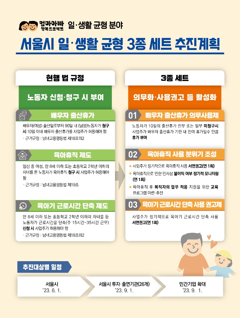 ‘서울시 일‧생활 균형 3종 세트’는 아이 키우기 좋은 도시를 만들기 위한 「엄마아빠 행복 프로젝트」의 일환이자, 저출생 위기 극복을 위한 대책의 하나다. 불이익에 대한 우려로 육아휴직 등 사용이 어려운 현실을 반영, 일하는 엄마아빠들이 법적으로 보장된 모‧부성권 보호제도를 적극 사용하도록 사업주가 나서서 활성화한다는 목표다.