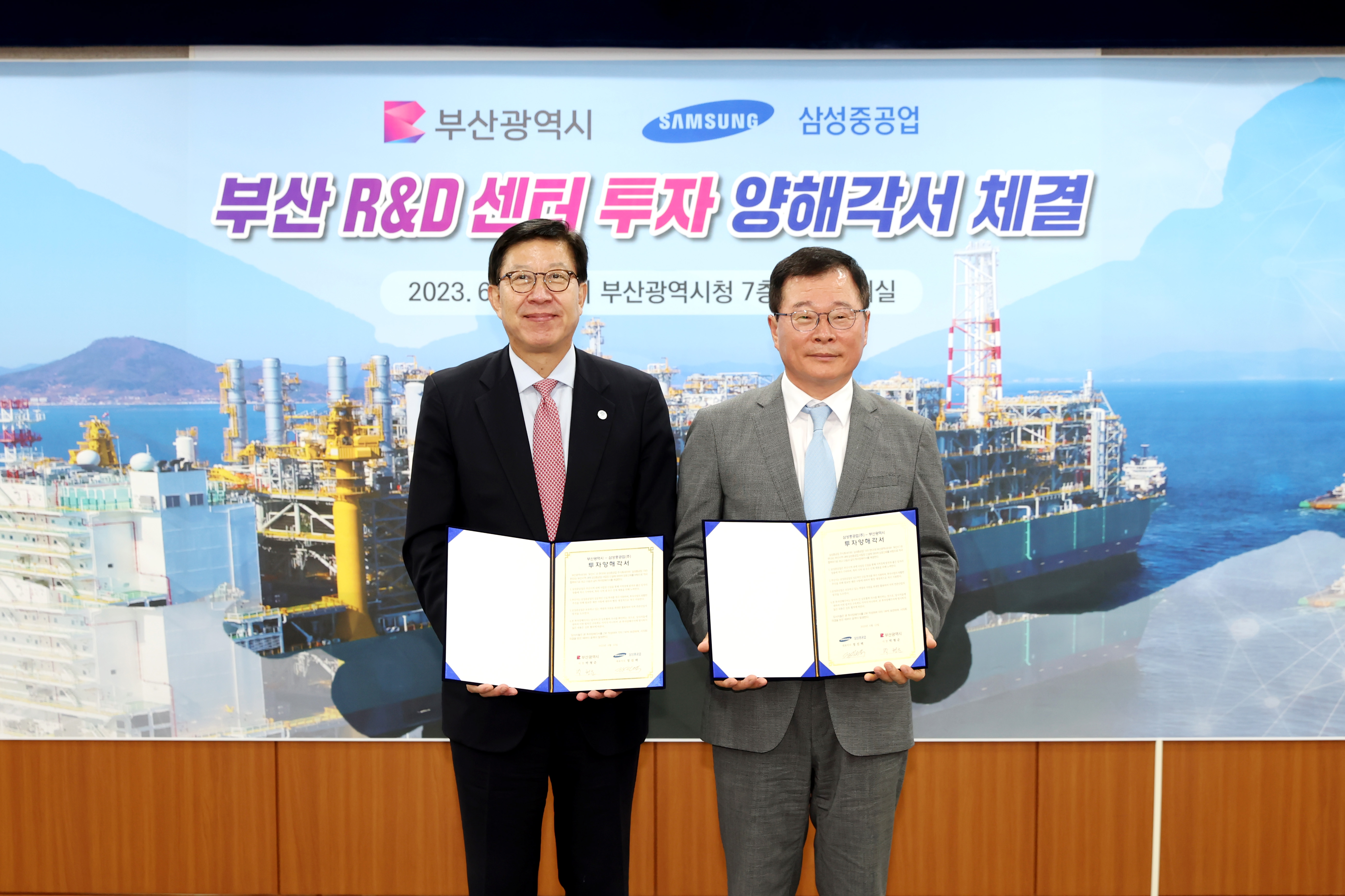 삼성중공업은 부산시와 (가칭)'부산 R&D 센터' 설립에 관한 투자양해각서(MOU)를 체결한다고 12일 밝힘. 이 날 협약 체결에는 정진택 삼성중공업 사장과 박형준 부산시장 등 주요 관계자가 참석했다.