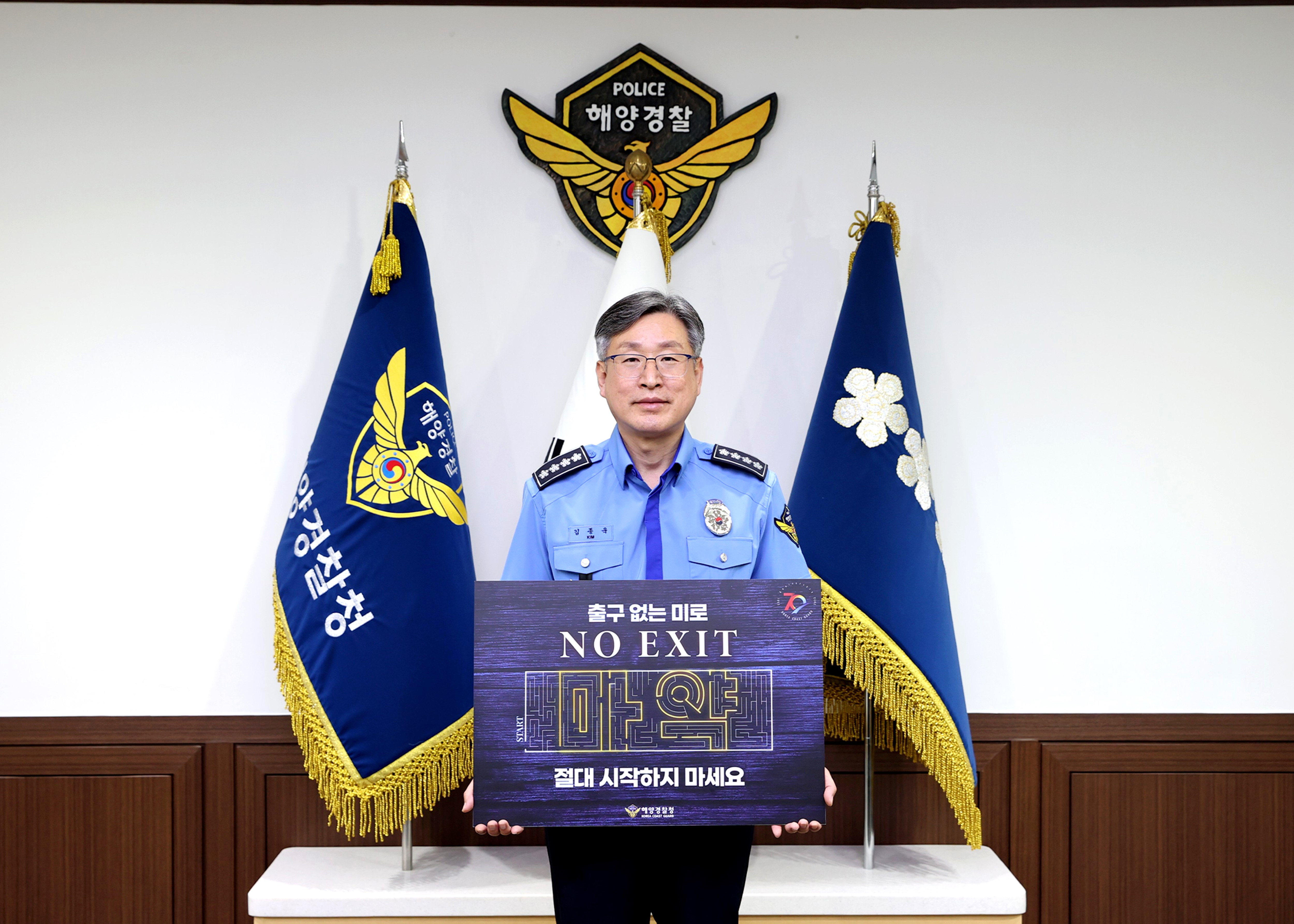 이기식 병무청장으로부터 지명을 받은 김종욱 해양경찰청장은 이날 ‘출구 없는 미로 노 엑시트(NO EXIT) 절대 시작하지 마세요’라는 문구를 담은 피켓을 들고 인증 사진을 찍으며 마약범죄 예방 릴레이 캠페인에 참여했다.