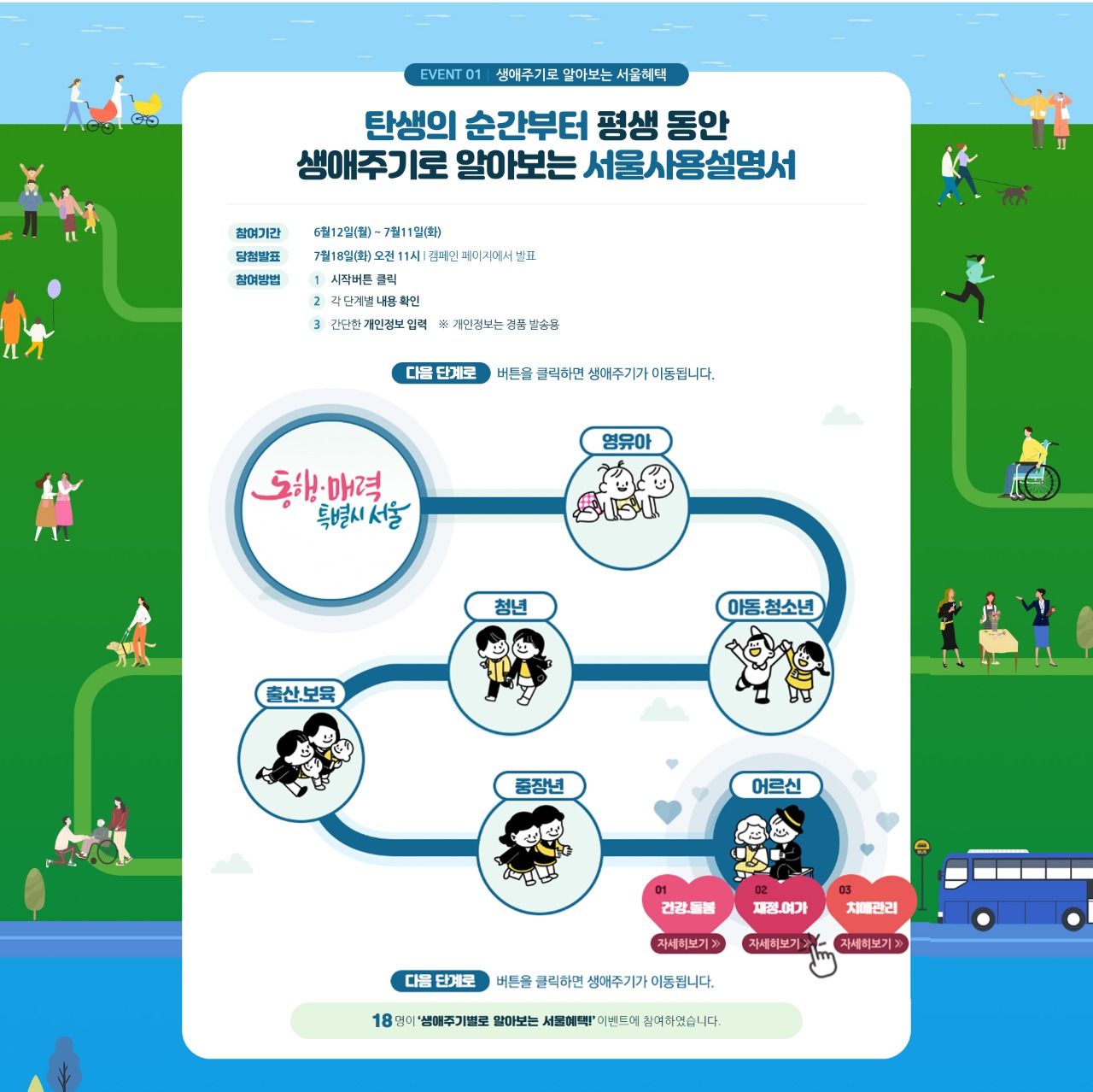 먼저, ‘생애주기로 알아보는 서울사용설명서’ 이벤트에서는 영유아, 아동‧청소년, 청년, 출산‧보육, 중장년, 어르신 등 생애주기별로 서울시가 추진하는 주요 정책을 단계별로 한 눈에 볼 수 있다.