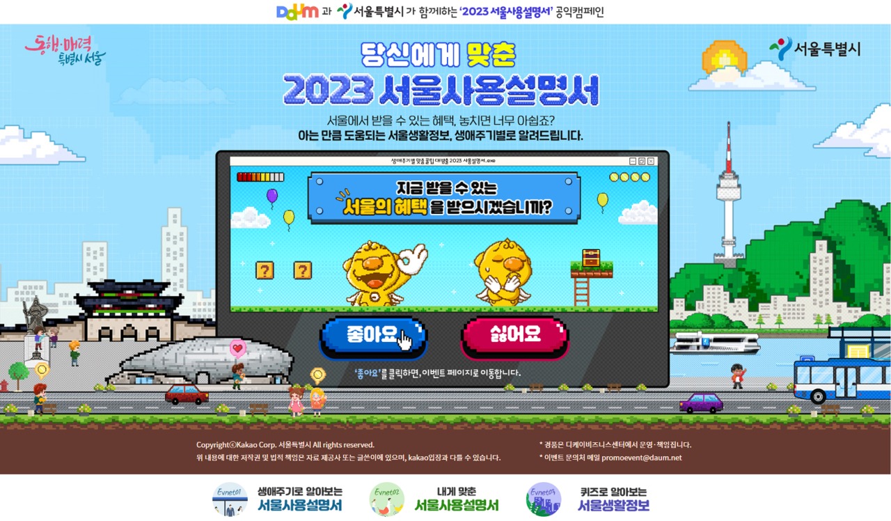 시는 이번 캠페인 내 이벤트 참여자를 대상으로 450명을 추첨해 커피 및 치킨 쿠폰 등을 제공할 예정이다. 이벤트 참여는 네이버 및 다음에서 ‘서울’을 검색하여 캠페인 페이지로 들어가거나 캠페인 페이지(https://promotion.daum-kg.net/seoulmanual)를 직접 방문하여 참여 가능하다.