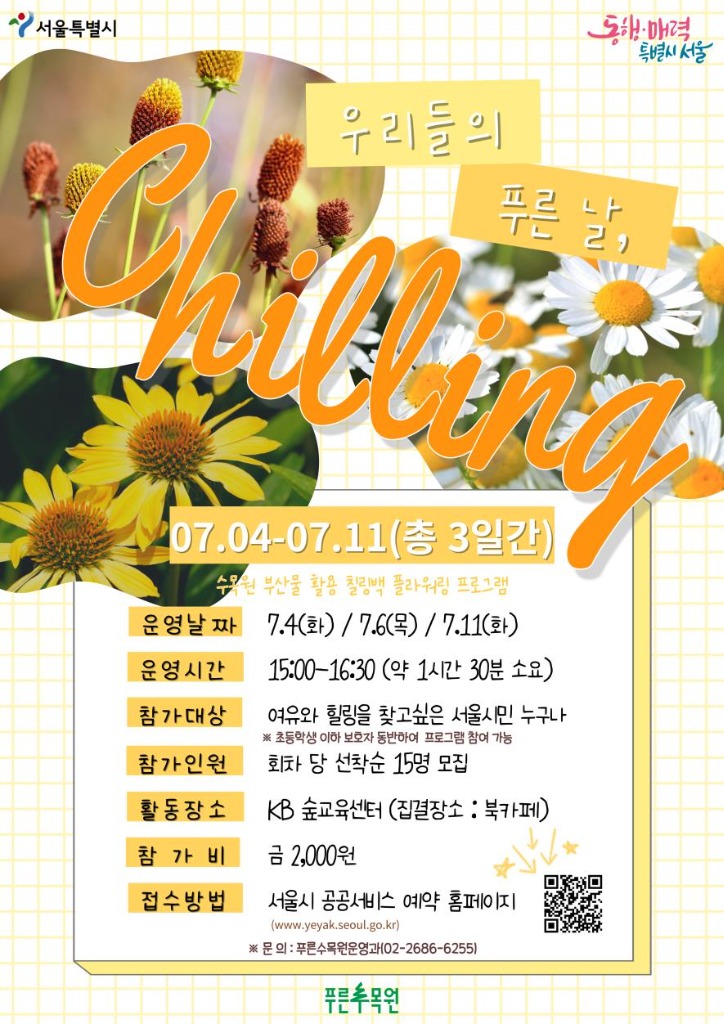 ‘Chilling’은 ‘휴식을 취하다, 친구들과 편하게 논다’와 같은 휴식의 의미인데 자연 속에서 일상의 스트레스와 더위를 식히고 여유를 느끼고자 추진하는 프로그램이며 참가비는 2천원이다.