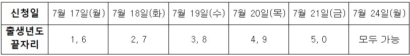 시는 사전신청 기간 중 동 주민센터를 통한 방문 신청자가 많을 것으로 보고, 방문신청에 한해 신청접수를 시작하는 7월17일(월)부터 21일(금)까지는 출생년도 끝자리에 따라 5부제로 나누어 신청을 받는다. 24일(월)에는 출생년도 상관없이 신청할 수 있다.