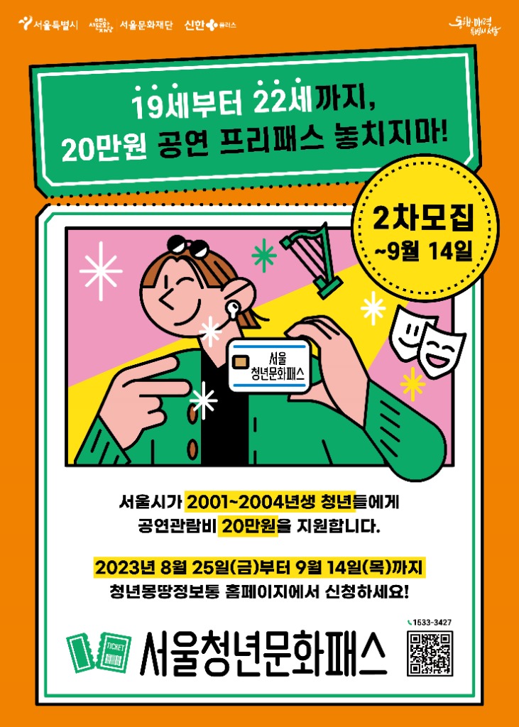 서울시는 서울거주 청년들에게 공연 관람에 사용할 수 있는 연 20만 원의 문화이용권을 지원하는 ‘서울청년문화패스’의 하반기 참여 신청을 8.25.(금) 9:00~9.14.(목) 18:00 기간 내 접수 받는다.