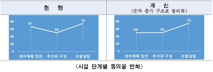 시는 ▴주민 참여 신속통합기획 전면 도입('21.9.) ▴주택공급 기조 (신속․확대 공급) 변화 ▴사업단계별 동의율 개편(순차 증가구조) 필요성 등 최근 사회․정책적 여건 및 제도변화에 맞춰 입안 동의요건을 합리적으로 개선키로 했다.