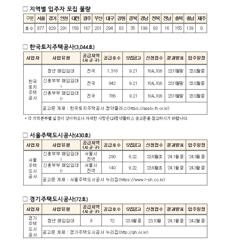 한국토지주택공사에서 모집하는 청년(1388호)·신혼부부(1728호) 매입임대주택에 대한 모집 정보는 오는 21일부터 한국토지주택공사 청약플러스( https://apply.lh.or.kr )에서 확인할 수 있으며, 서울주택도시공사 등에서 모집하는 청년·신혼부부 매입임대주택(502호)에 대한 모집 정보는 해당 기관별 누리집에서 확인할 수 있다.