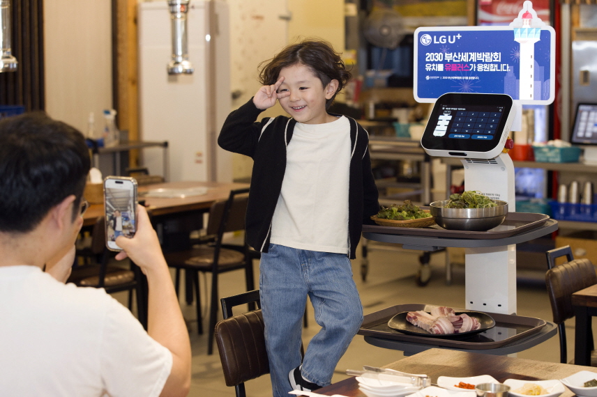 이날 U+서빙로봇은 "2030 부산세계박람회 유치를 LG U+가 응원합니다"라는 문구와 함께 부산타워·태종대·광안대교 등 부산의 랜드마크를 형상화한 판넬과 함께 손님을 맞이했으며, 고객들은 로봇과 셀카를 찍는 등 특별한 즐거움을 만끽했다.