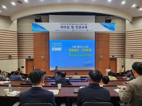 경기주택도시공사(GH)가 24일 경기도 수원시 차세대융합기술연구원에서 처장급 이상(사장 및 임원 포함) 고위직을 대상으로 '2023년 고위직 맞춤형 통합폭력예방교육'을 실시했다고 밝혔다.