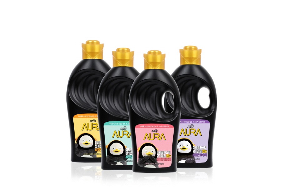 LG생활건강은 기존 샤프란 아우라 제품에 펭수 이미지를 담은 새 패키지를 선보였다. 펭수 에디션은 섬유유연제 특유의 은은한 파스텔 색상에서 변화를 줘 강렬한 검정색을 입히고 시각적인 차별화를 뒀다.