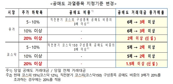 아울러 주가가 당일 20% 이상 하락한 종목은 공매도 거래대금 증가배율을 코스피 2배, 코스닥 1.5배로 하는 지정기준을 새로 만들었다.