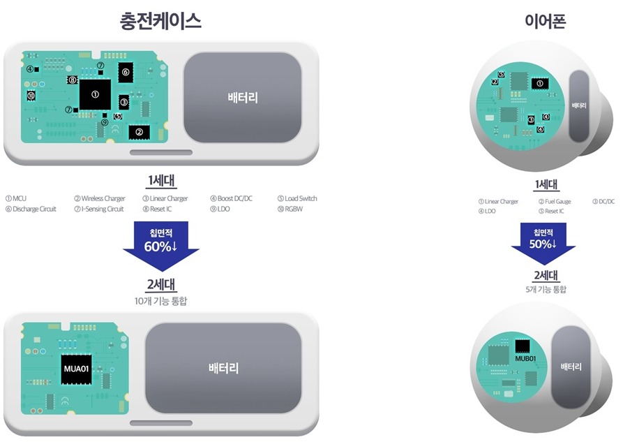이번에 선보인 전력관리칩은 충전케이스에 탑재되는 ‘MUA01’과 이어폰용 ‘MUB01’이다. 각각 10개, 5개 내외의 다양한 칩들을 하나로 통합한 ‘All in One’ 칩으로 보다 넓은 배터리 공간을 설계할 수 있게 한다.