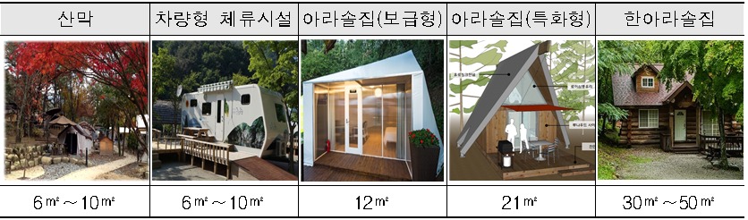 환경부와 국립공원공단은 어린이·노인·장애인을 포함한 가족이나 야영장비가 없는 탐방객들이 사계절 내내 자연을 즐길 수 있도록 아라솔집(에코캐빈), 한아라솔집(에코랏지), 차량형 체류시설(카라반), 산막 등 4가지 유형의 체류형 자연체험시설을 단계적으로 늘리기로 했다.