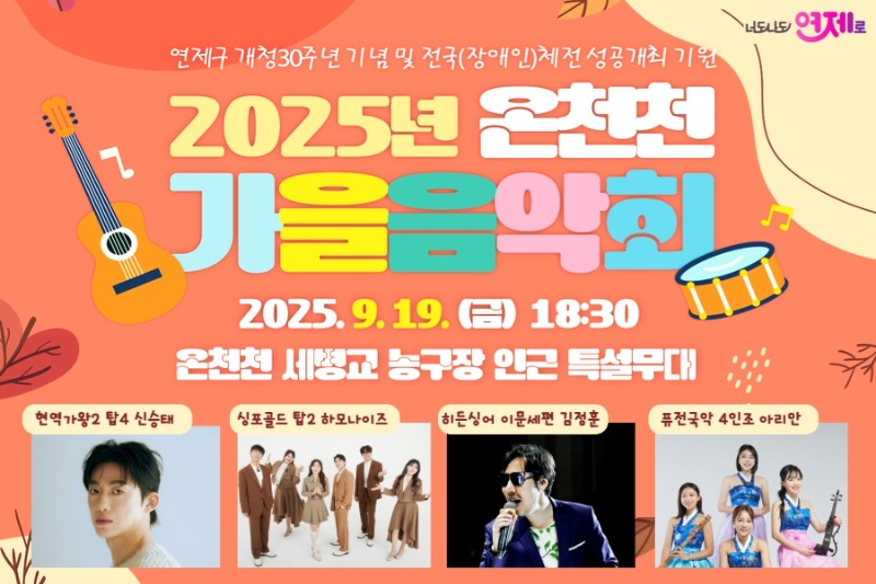 연제구(구청장 주석수)는 오는 9월 19일 온천천 세병교 인근 특설무대에서 ‘2025년 온천천 가을음악회’를 연다.