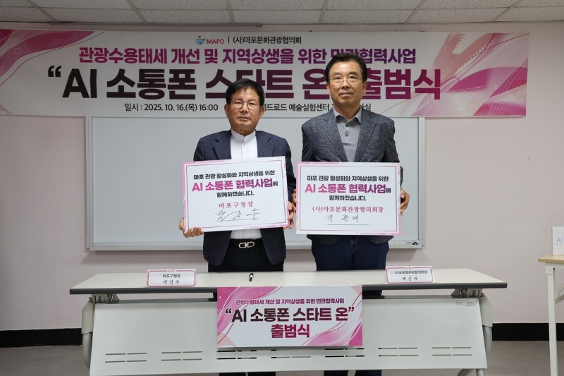 마포구(구청장 박강수)는 10월 16일 오후 4시, 레드로드예술실험센터 2층 세미나실에서 ‘AI 소통폰 스타트 온(Start ON)’ 협력사업 출범식을 열고 외국인 관광객과 상인의 소통 강화를 위한 민·관 협력의 첫발을 내디뎠다. 이번 사업은 (사)마포문화관광협의회가 주관하고 마포구와 레드로드 상인들이 함께 추진하는 민·관 협력 프로젝트로, 외국인 관광객과 상인들이 언어의 장벽 없이 자유롭게 소통할 수 있도록 AI 통·번역기 ‘소통폰’을 상인들에게 대여하는 방식으로 진행된다.