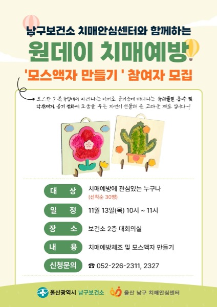 치매예방 프로그램 참여를 희망하는 주민과 기관은 남구보건소 치매안심센터(052-226-2323)로 문의하면 된다.