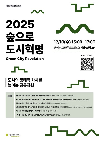 ‘제5회 숲으로 도시혁명’ 포럼은 12월 5일까지 이벤터스와 서울그린트러스트 홈페이지(greentrust.or.kr) 및 SNS 채널을 통해 사전 참가 신청을 받으며, 참여를 희망하는 시민 누구나 무료로 신청할 수 있다.