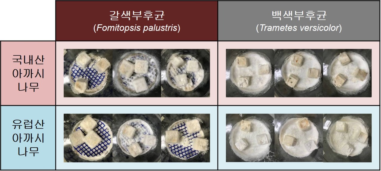 목재 내후성 시험은 KS규격에 따라 갈색부후균은 부후개떡버섯 (Fomitopsis palustris, FOP), 백색부후균은 구름버섯(Trametes versicolor, COV)을 사용하였으며, 국산 아까시나무의 목재는 방부처리를 하지 않고도 야외에서 장기간 사용할 수 있는 천연내후성 1-2등급(유럽기준)으로 분류되었다.