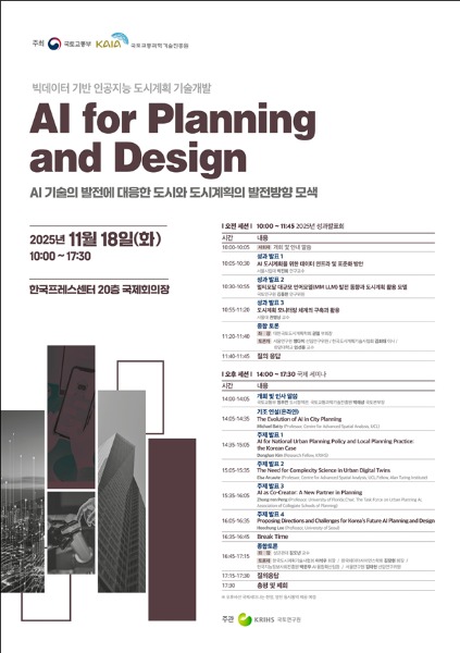 이번 행사는 국토교통부가 국가 연구개발 사업으로 지원한 ‘빅데이터 기반 AI 도시계획 기술개발’*의 성과발표회(오전)에 이어 AI 도시계획 분야 국내외 전문가가 참여하는 국제세미나(오후) 순으로 진행된다.