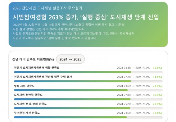 천안시 도시재생지원센터 오형석 센터장은 “센터의 역할에 대한 시민들의 긍정적인 평가가 실질적인 참여 경험이 263%로 상승하는 결과로 이어졌다”며 “2026년에도 시민이 사업의 주인공이 되는 참여의 장을 더욱 넓히고, 우리 동네의 변화를 생활 속에서 직접 체감하실 수 있도록 모든 역량을 집중하겠다”고 밝혔다.