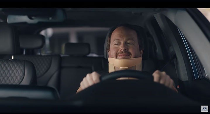 현대자동차의 ‘리어 뷰 모니터’ 광고에서는 목에 착용한 보호대 때문에 일상 생활에 불편을 겪는 한 싼타페 운전자가 고개를 돌리는 대신 싼타페의 후방 카메라 기능만을 이용해 편리하게 주차하는 모습이 재치 있게 연출됐다.