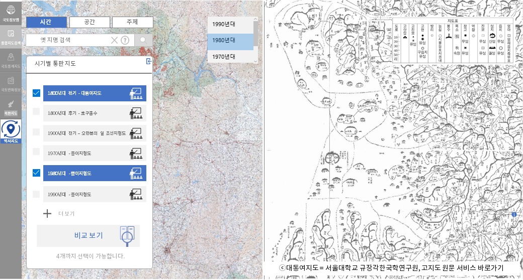 이르면 올해말부터 “국토정보 플랫폼(map.ngii.go.kr)”에서 동국여지도, 대동여지도와 같은 고지도를 비롯해 충청도, 강원도, 경기도 지역의 생활상을 담은 지리서 정보를 한 눈에 볼 수 있게 된다.