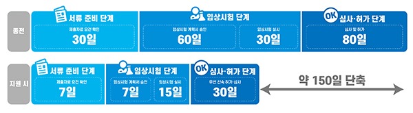 이에 따라 허가 신청서류 준비기간을 30일 → 7일로 단축하고, 임상 시험단계에선 임상시험 가이드 제공과 계획서 신속 승인으로 임상시험 개발과 시험실시 기간을 90일 → 22일 이내로 단축시킬 예정이다.