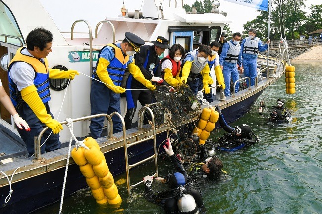 포스코 클린오션봉사단 광양시 태인동 배알도 수중에서 플라스틱, 폐그물 등 쓰레기 약 1톤 수거