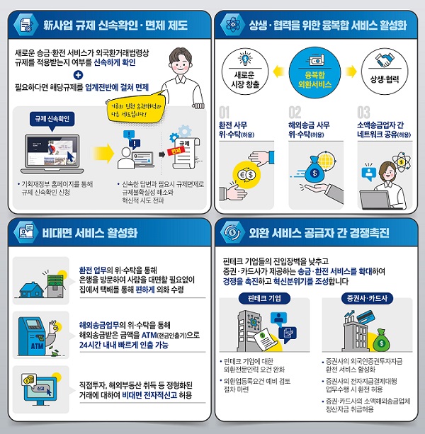 이번 혁신안에 따라 환전사무의 위·수탁이 허용된다. 현재까지는 은행·환전영업자만 환전업 수행이 가능해 고객은 환전 신청, 대금 수령 모두 은행이나 환전영업자를 거쳐야만 가능했지만 외국환거래규정 개정으로 이제는 시간·장소에 구애받지 않고 서비스 이용이 가능해졌다.