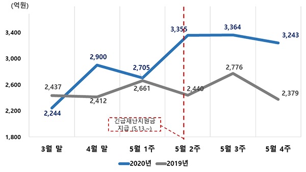또 전체적으로 8개 카드사 가맹점 전체 매출액은 긴급재난지원금 지급 전인 5월 1주(5.4~5.10) 15조 7833억원에 비해 5월 4주(5.25~5.31)에 19조 1232억원 (↑3조 3399억원)으로 약 21.2% 증가했고, 전년 동기 대비 약 26.7% 증가했다.