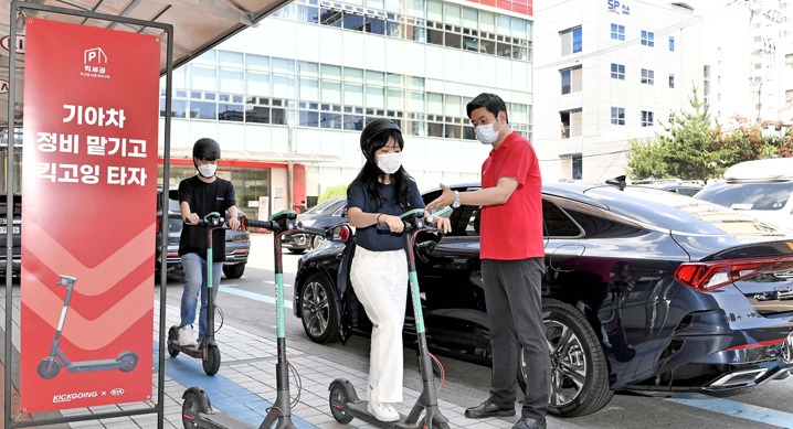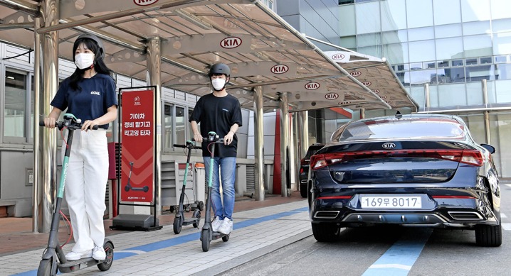 기아자동차가 직영서비스센터에서 공유형 전동킥보드 서비스를 선보인다.