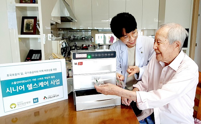 광주에 이어 대구에서 KT는 지역 내 국가유공자와 취약계층 어르신 80명에게 ‘스마트 약상자’를 보급했다. 스마트 약상자는 약 복용 시간에 알람을 주고 어르신이 약을 복용하면 데이터를 서버에 전송하는 솔루션이다.
